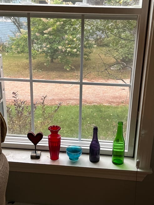 Her sister Bertie gave her the idea. In her garden she had several metal rods tucked into the hostas. On each rod rested a bright colored wine-sized bottle. There were blues, purples, greens, yellows, and even one red. The sun glinted off them and they added a lovely and whimsical ambiance to her beds. Scarlett had flowers as well, but in a much smaller scale. She decided to collect her own bottles, but soda pop-sized. She needed just six—blue, yellow, purple, green, pink, and red. In addition, Scarlett vowed to pay no more than ten dollars per bottle. At an old red building in South Freeport, she scored her first two bottles—green and purple. She did find a blue bottle at another shop but it was too pricey. Even after several stops at the antique shops along route one, there were no other colors to be found. Scarlett realized her search for bottles might be a life-long quest, but no matter, she relished a good challenge. She lined her first two finds on her windowsill, along with a blue bowl, red vase, and a wooden heart. Come spring, she’d transfer her bottles into her raised beds along the walkway, perhaps among the petunias.